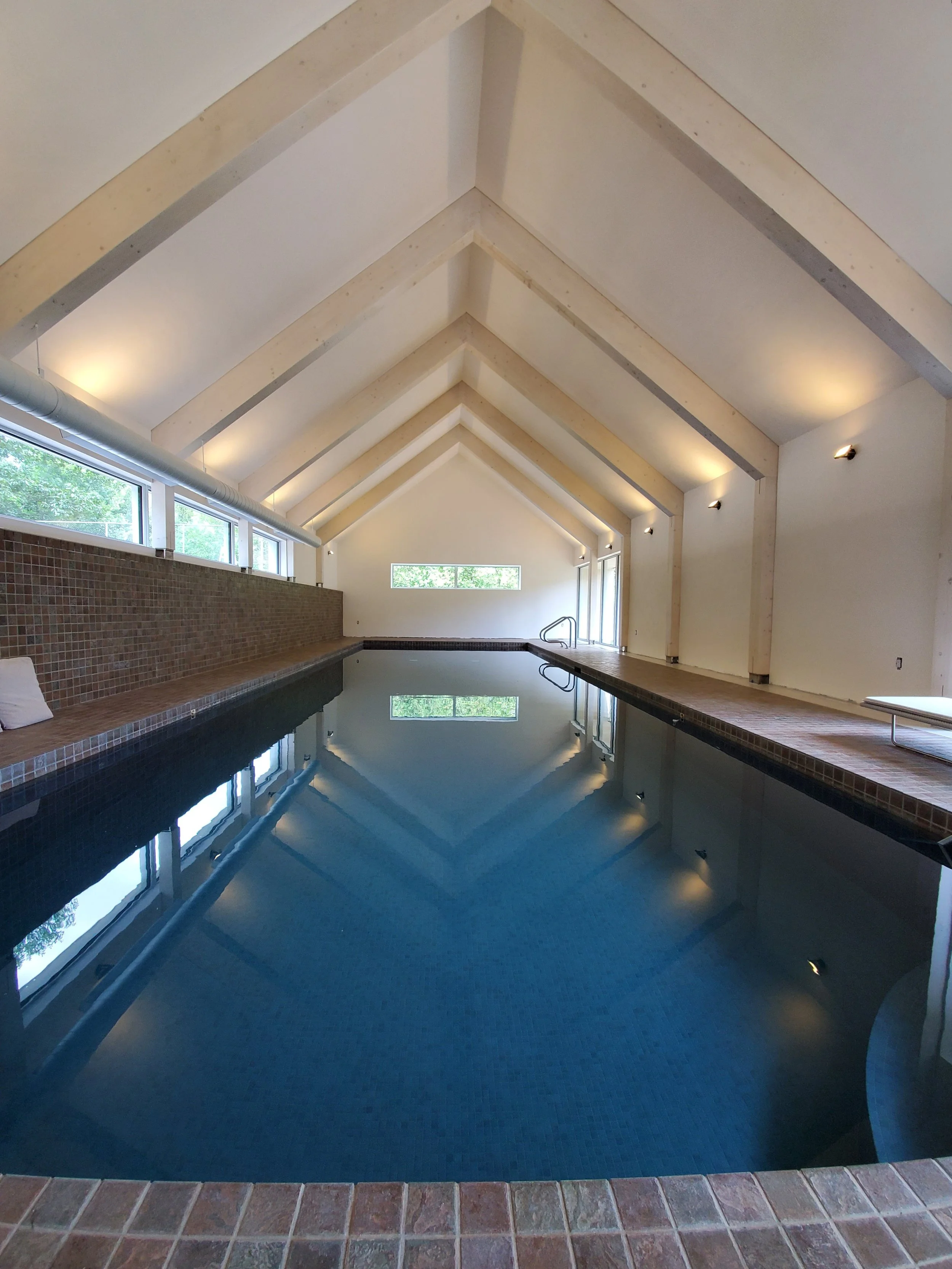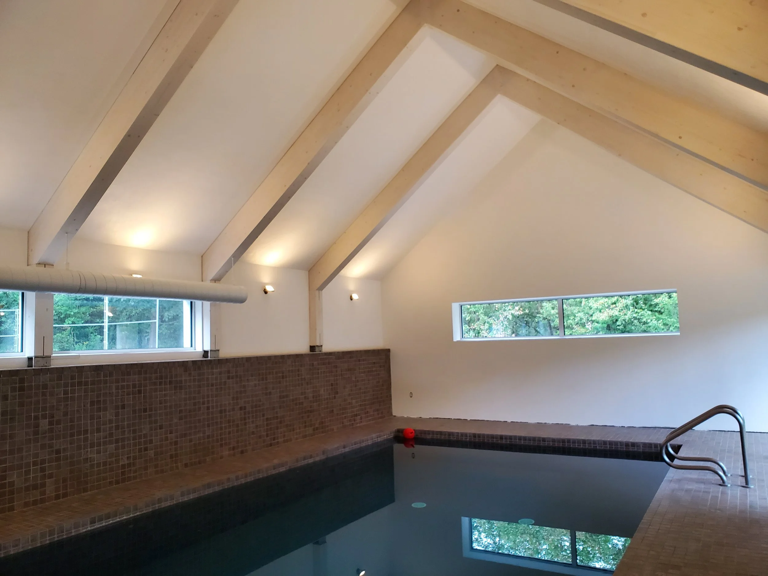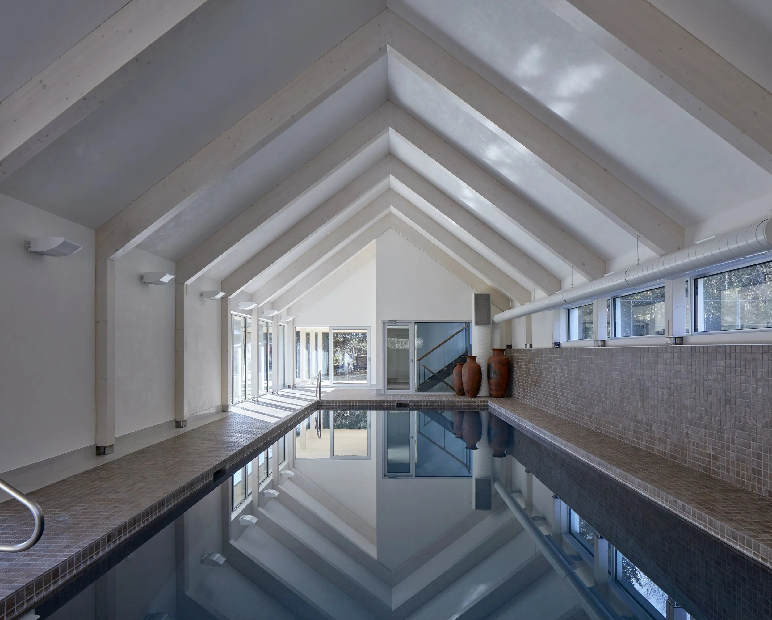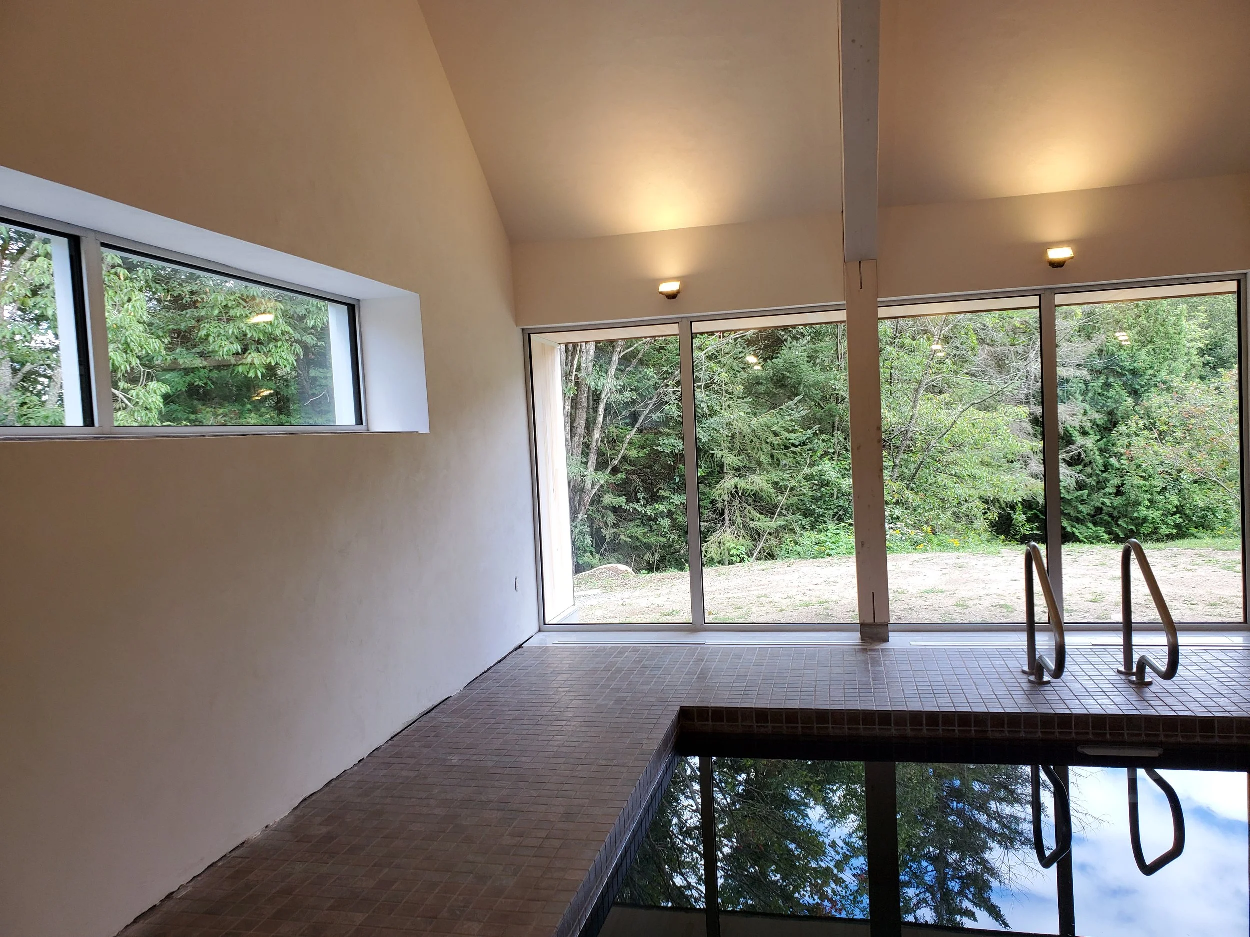 In the heart of the rural setting of Sainte-Adèle, in the Laurentides, lies a private pool where the interior surfaces have been carefully treated. A lime plaster with medium granularity has been applied, creating a subtle texture. Light troweling followed by a wax treatment was carried out, creating a muted ambiance. This luminous, rich, and soft renovation creates an enveloping and relaxing atmosphere - a unique space where natural beauty harmoniously blends with timeless elegance.