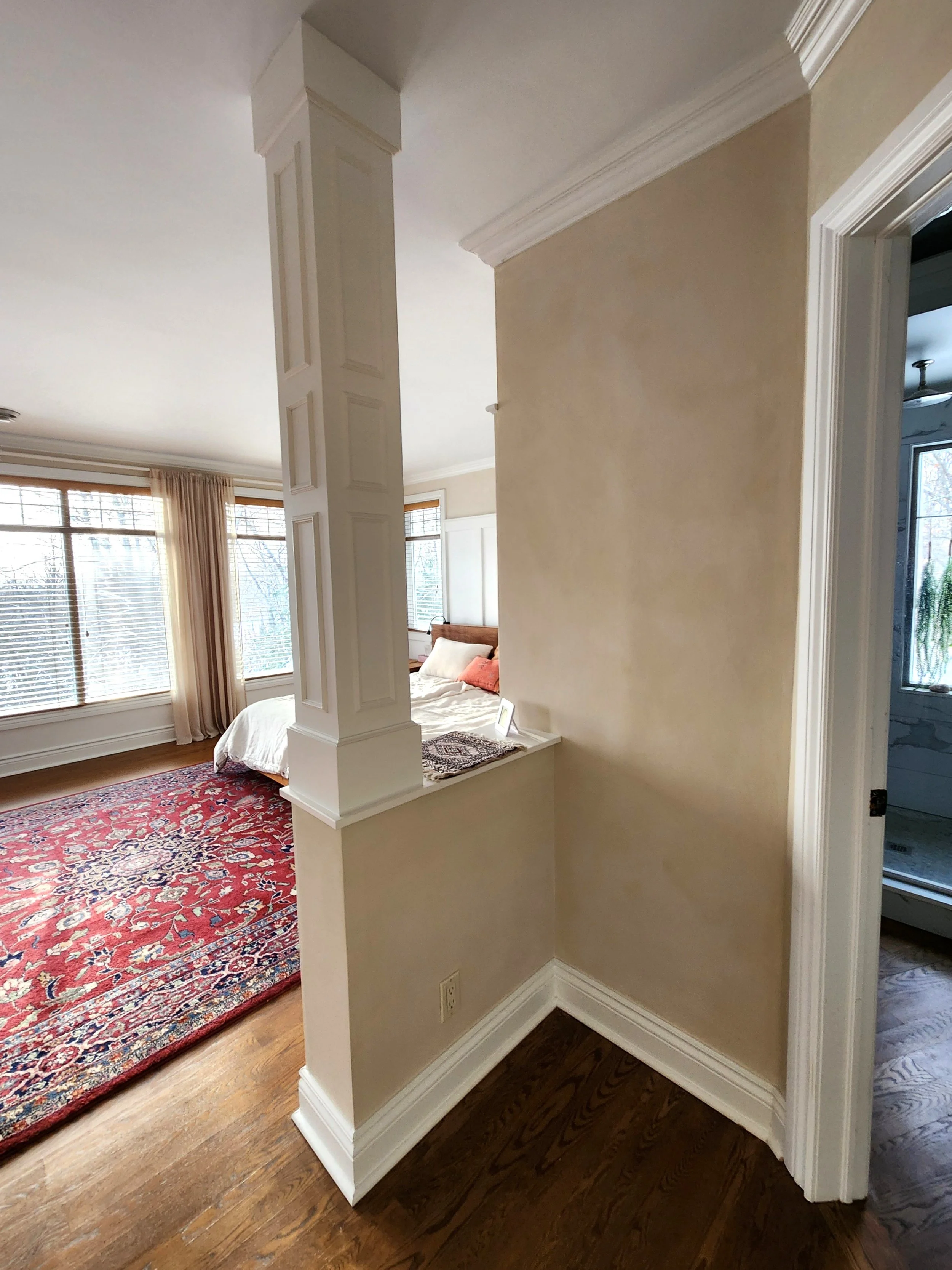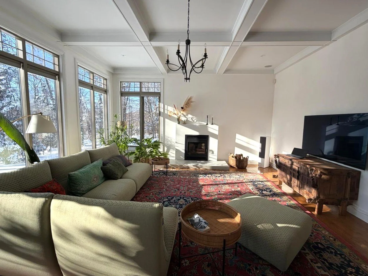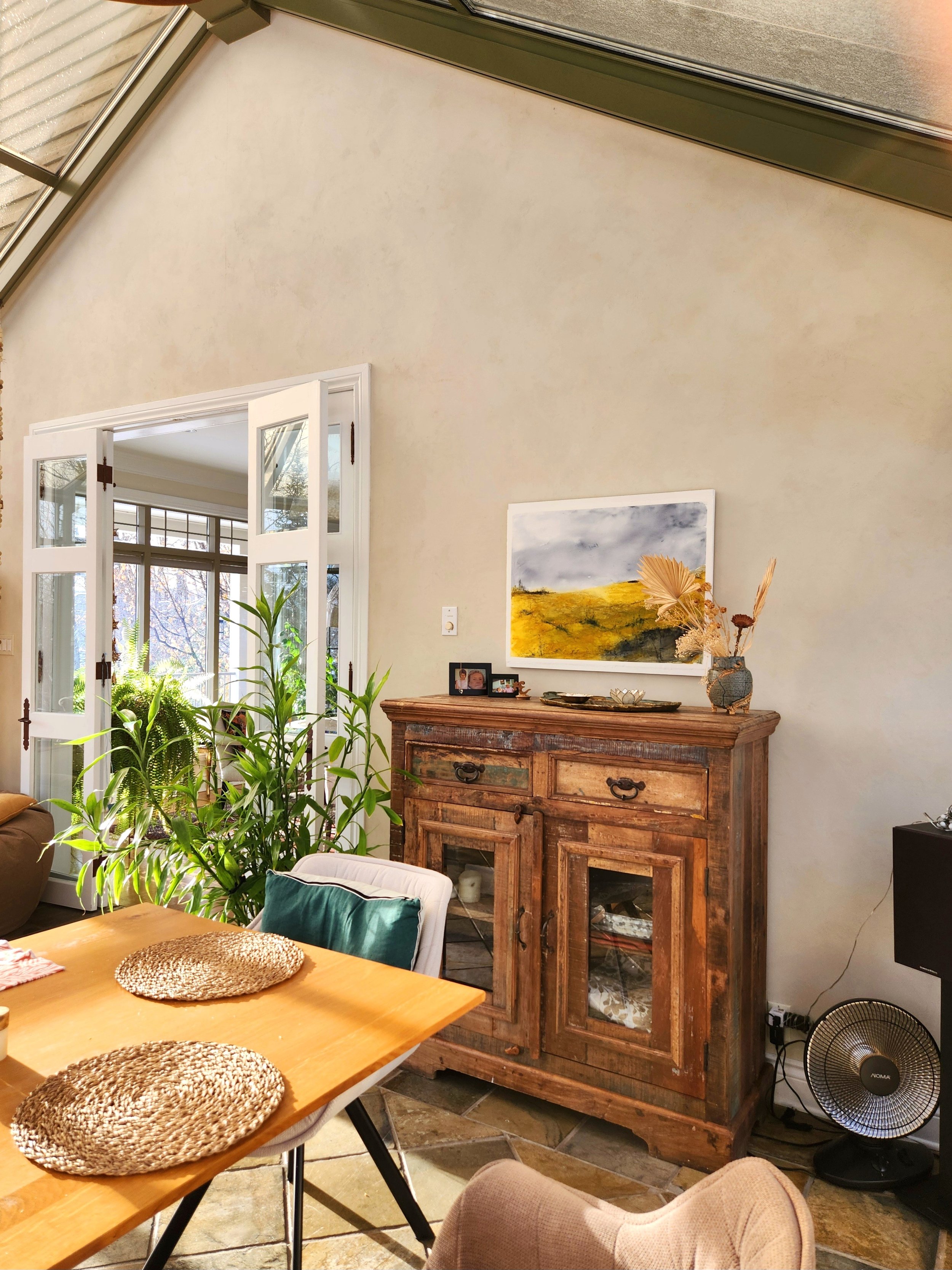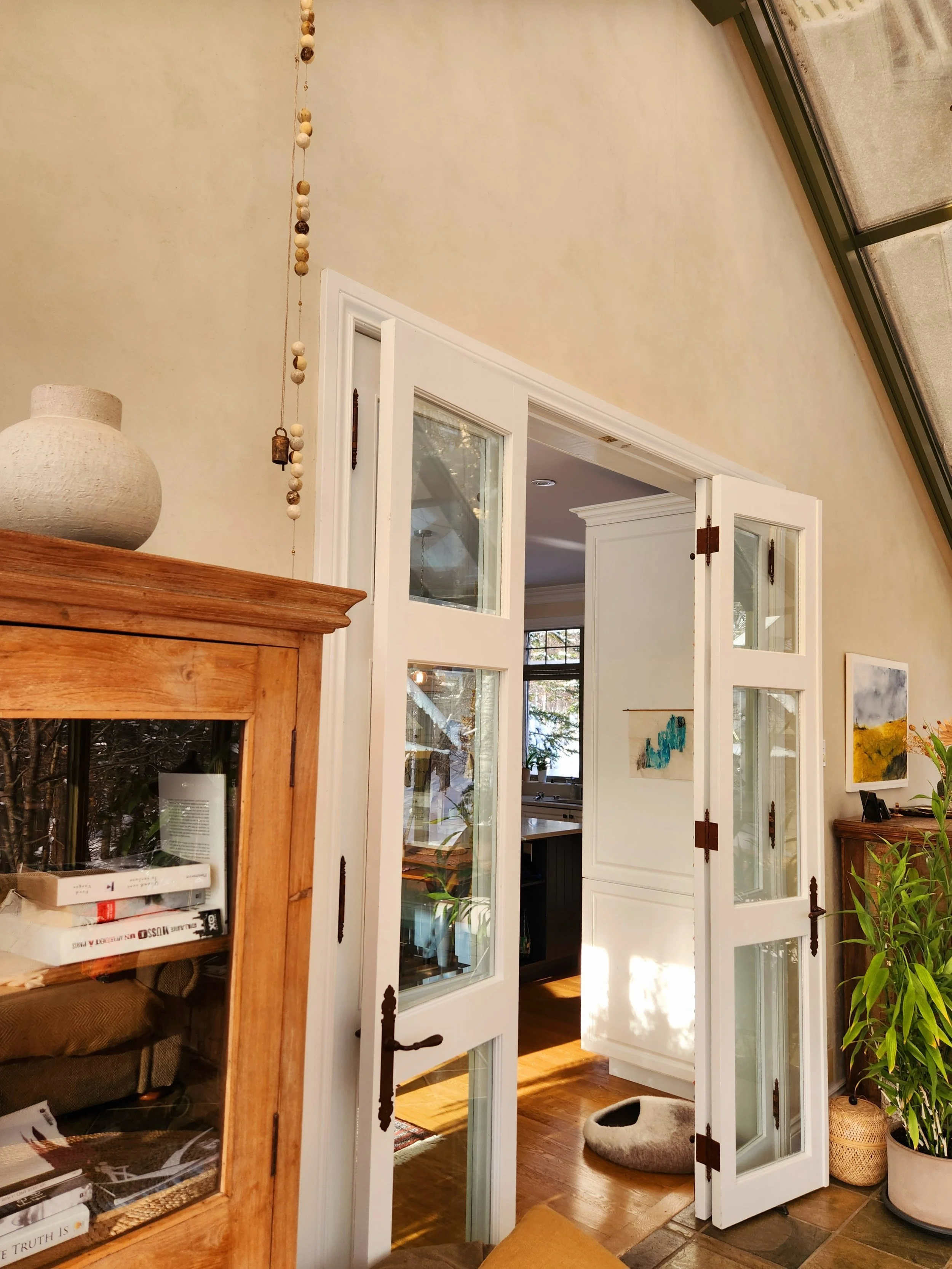 This residence becomes a perfect and luminous retreat where the softness of textures and hues creates a soothing atmosphere. The living room exudes serenity through a natural white lime paint that envelops the walls and fireplace mantel in a delicate, refined finish. The bedroom, treated with a limewash in shade 827 B-C, offers a velvety, warm texture, while the sunroom, coated with a fine 0.5 mm lime plaster in the same soft hue, extends this tactile and visual harmony. Noble materials enhance the architecture and invite contemplation.