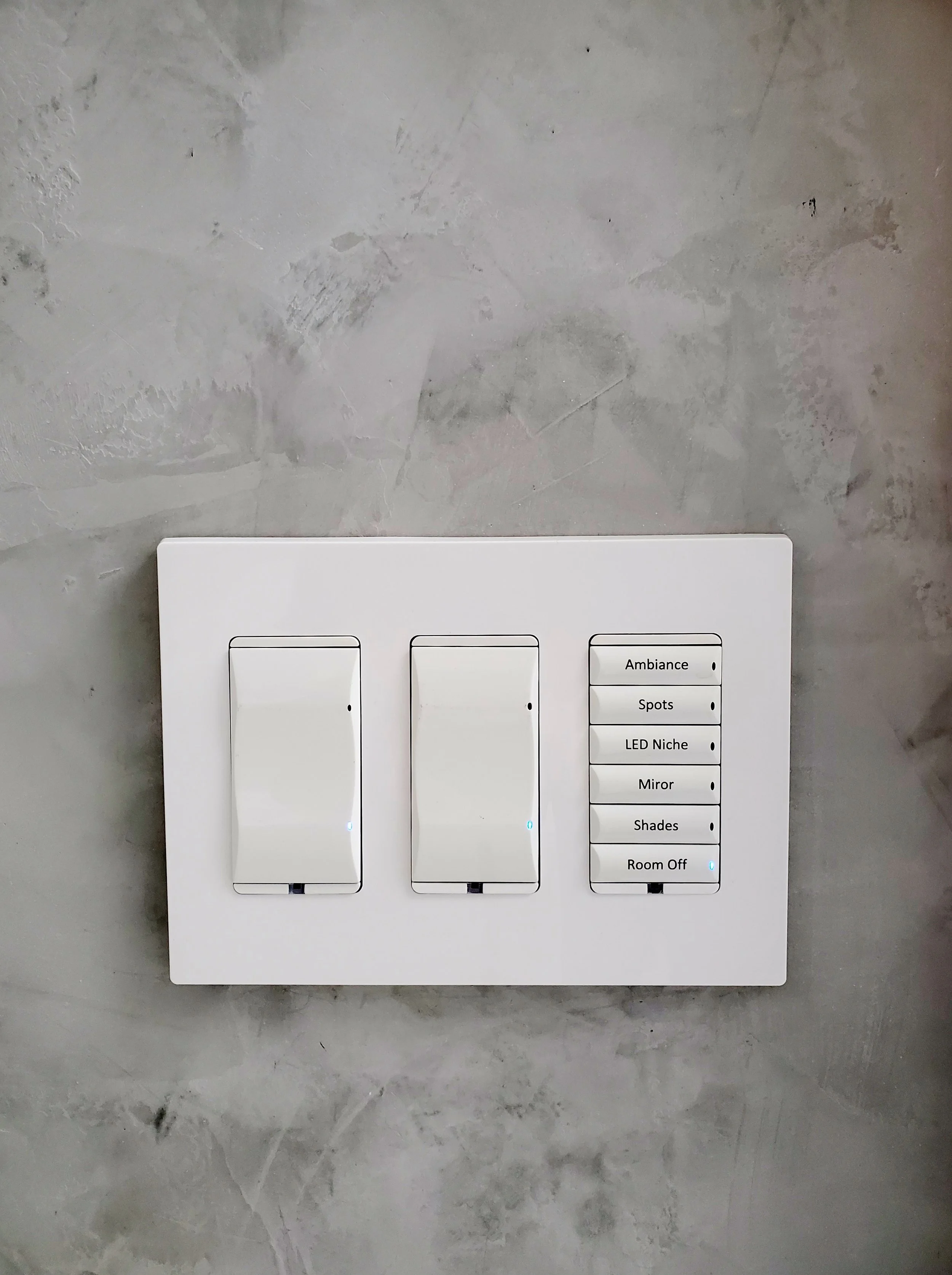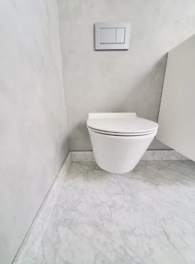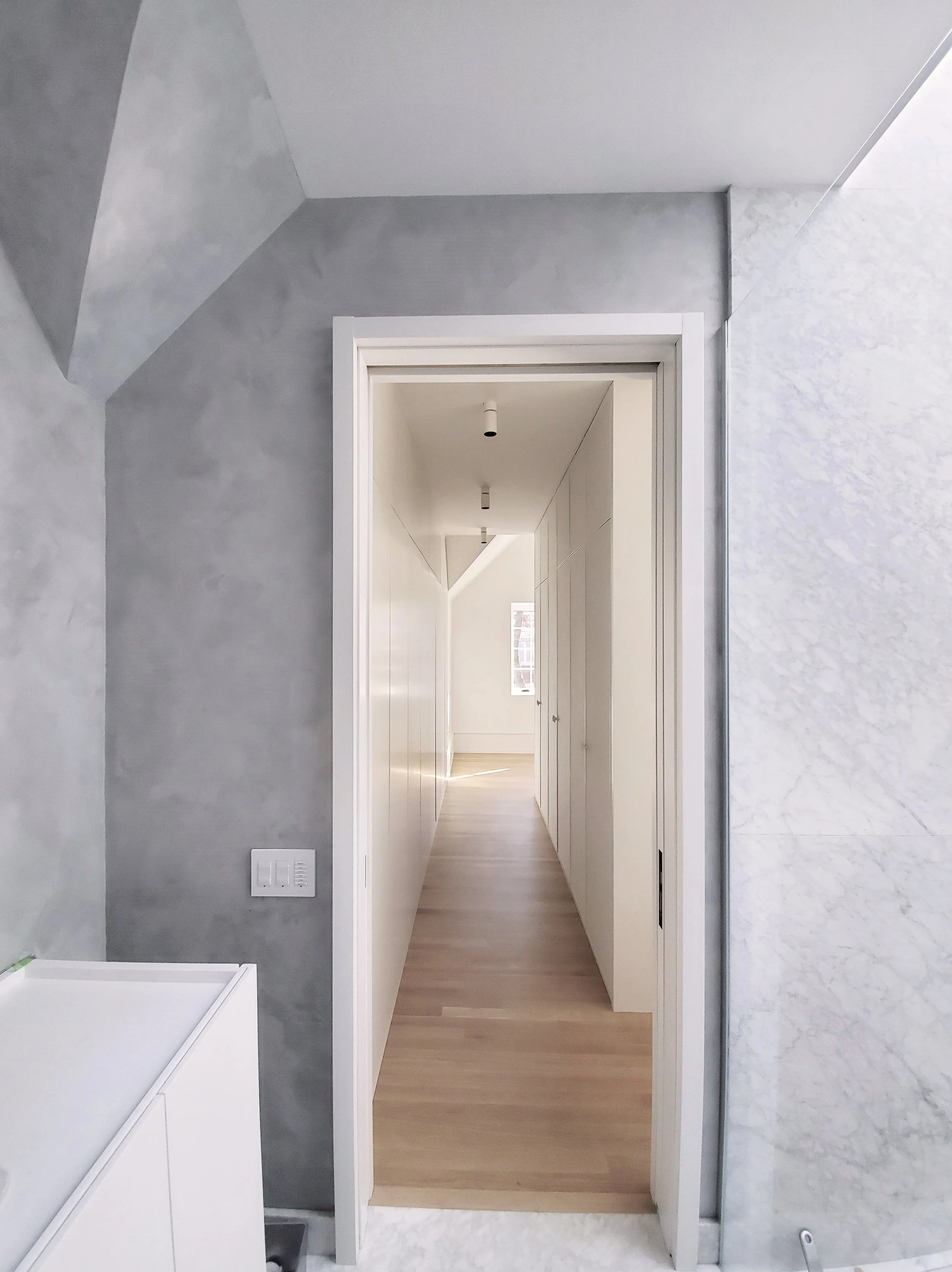 On a peaceful street in Outremont stands the master suite, where surfaces have been enhanced with an extremely fine lime-based plaster. The warm, nuanced shades of gray harmonize perfectly with the tones of the marble surfaces covering the walls and floors. In this elegant ambiance, a small wine cellar has also been created, adopting the same refined finish and showcasing the subtle alliance between lime and marble.