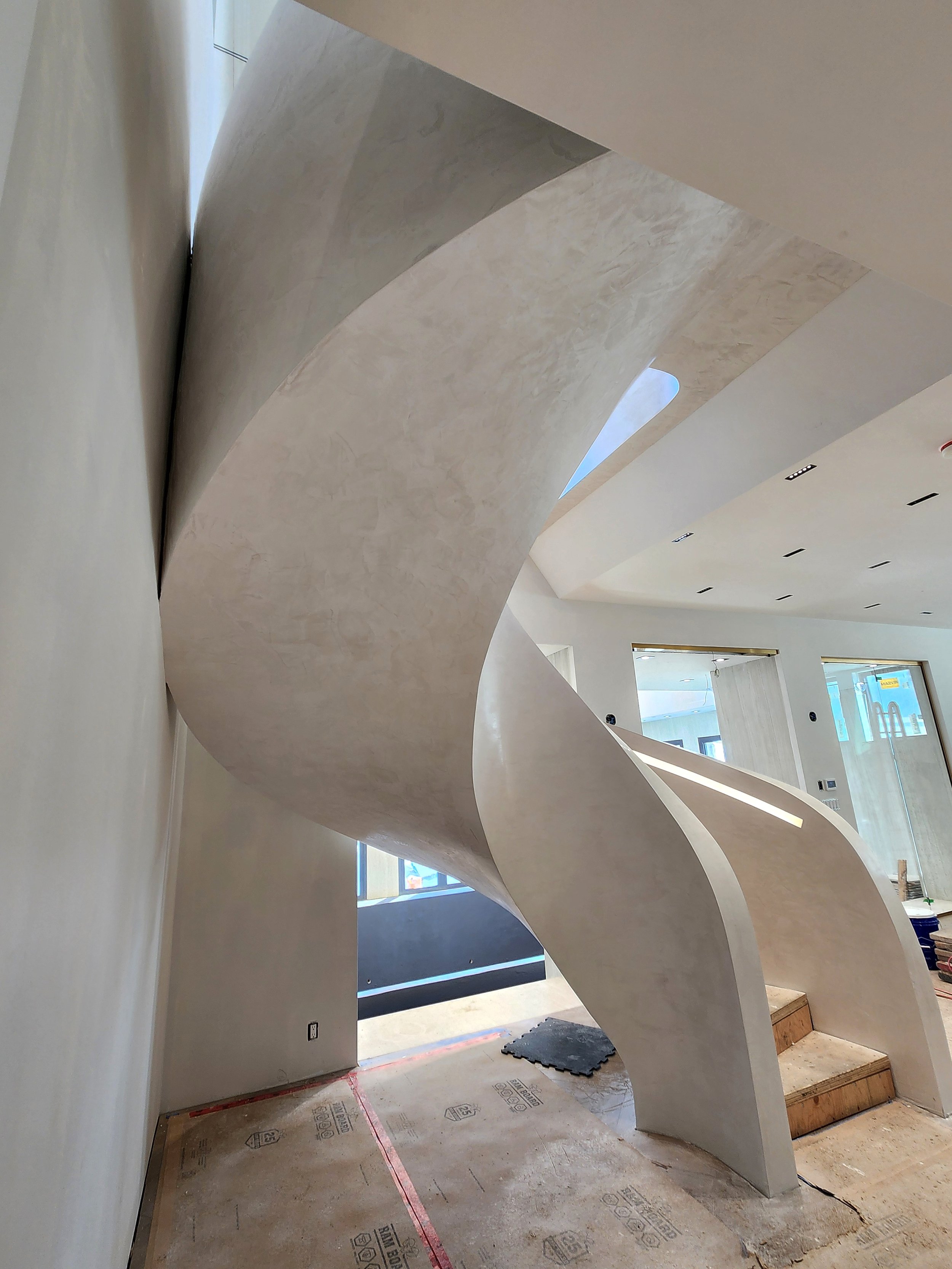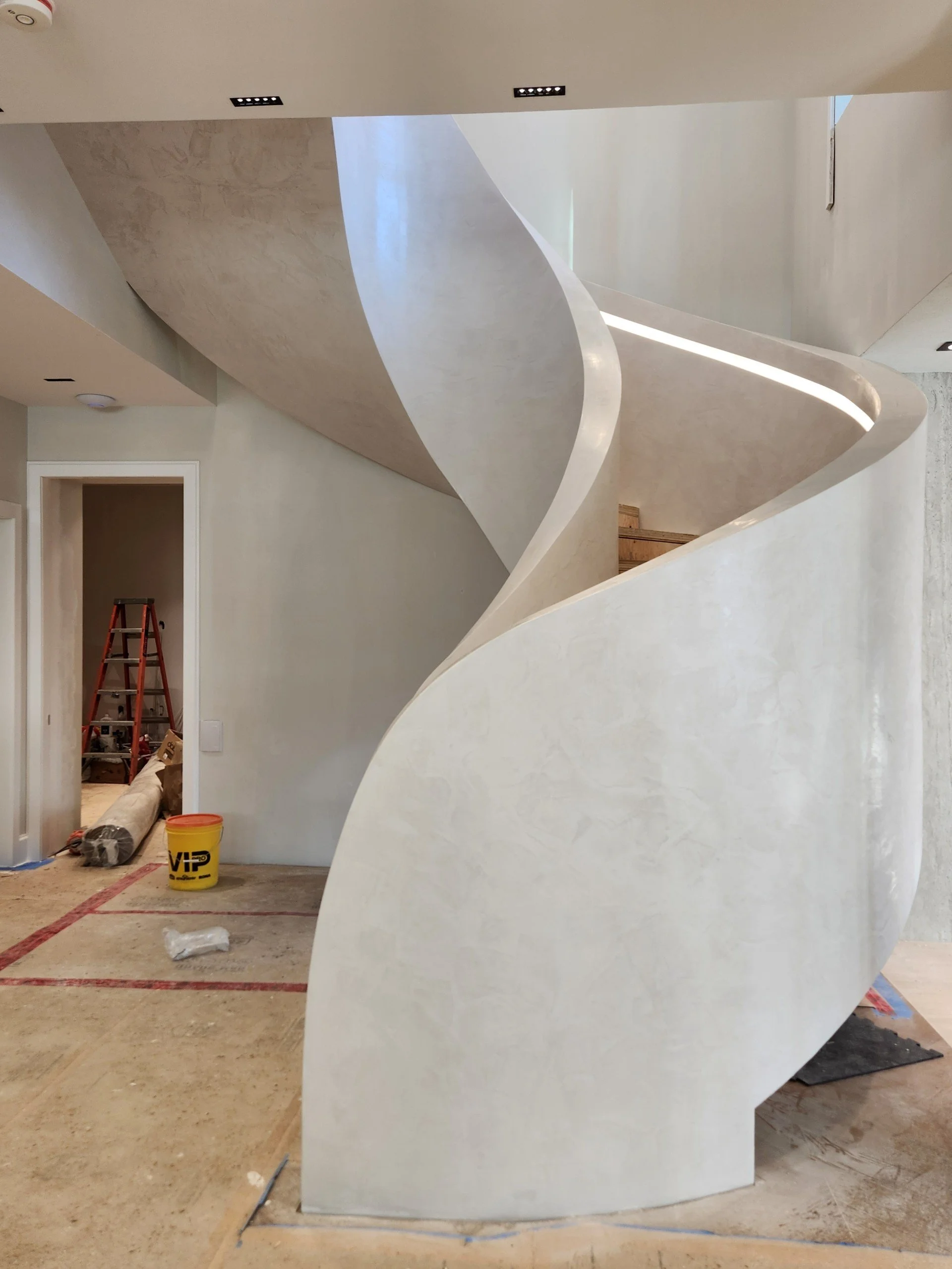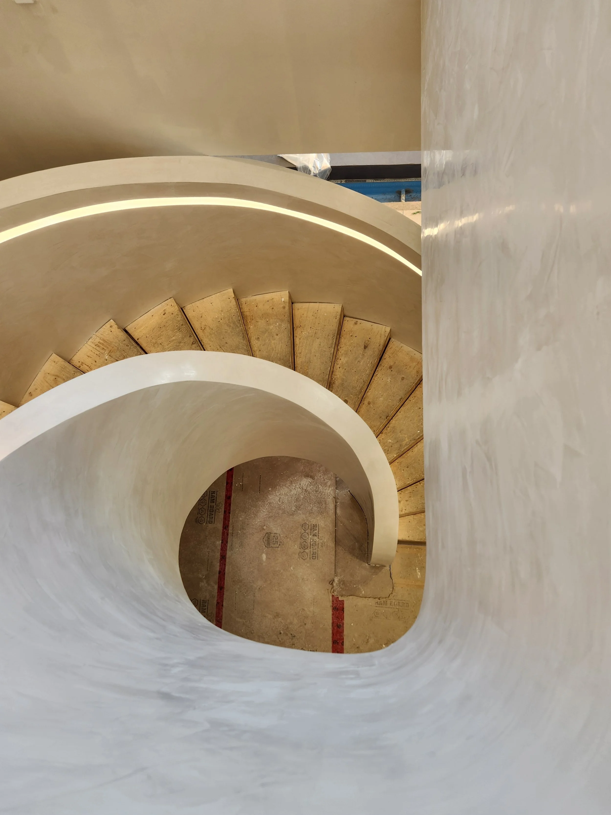 This exceptional architectural project showcases the fluidity of organic forms through meticulous application of smooth plasters. The sculpted curves and spiral staircase create a harmonious dialogue between shadow and light. The contemporary volumes reveal the purity of lines and the elegance of transitions. A realization where plaster becomes the very expression of architecture.