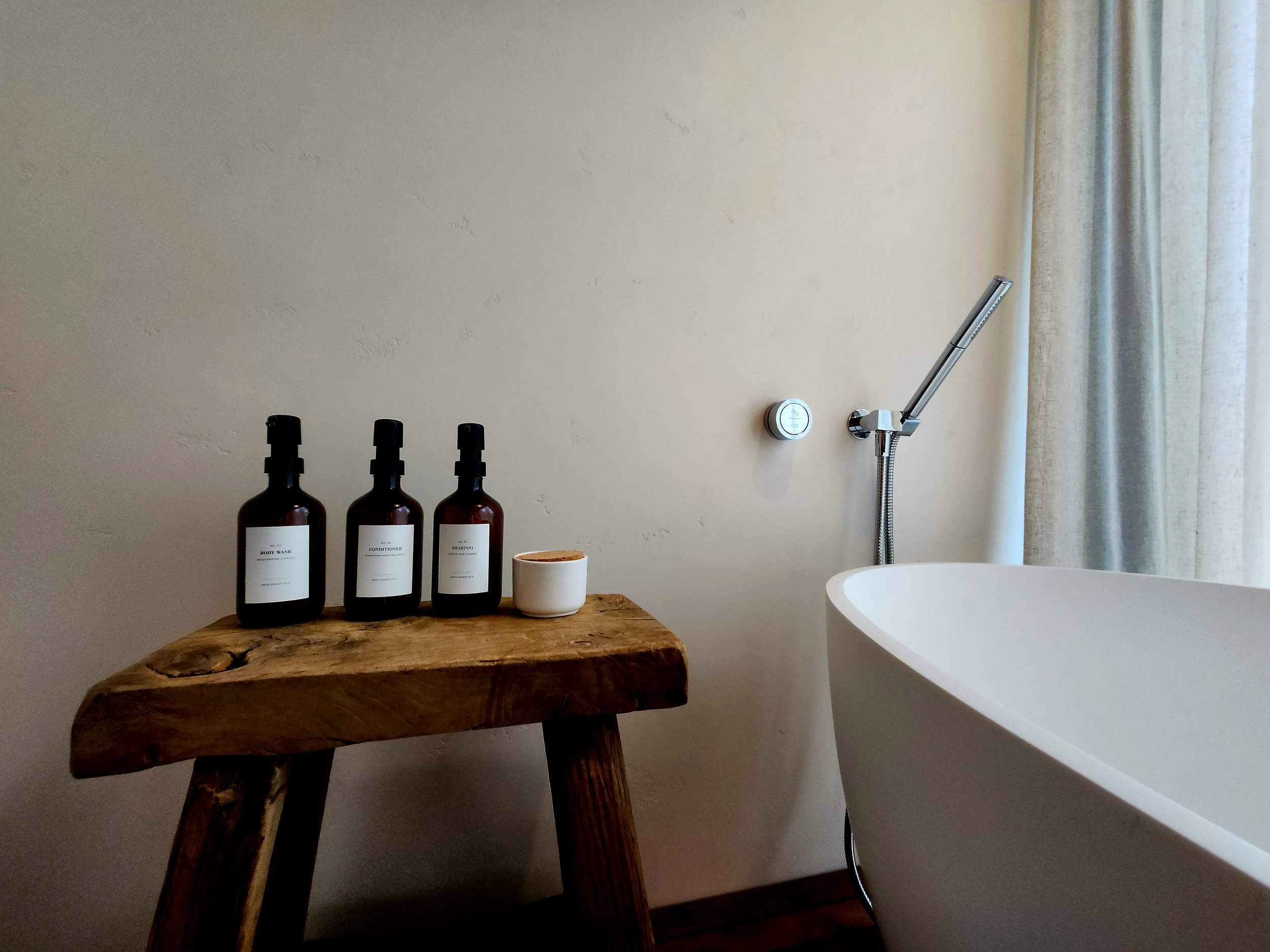 TADELAKT : Enduit à la chaux hydraulique inspiré d’une ancienne tradition marocaine, lissé au galet et traité au savon noir pour une finition d’une douceur soyeuse. Imperméable, il est idéal pour les douches et hammams.