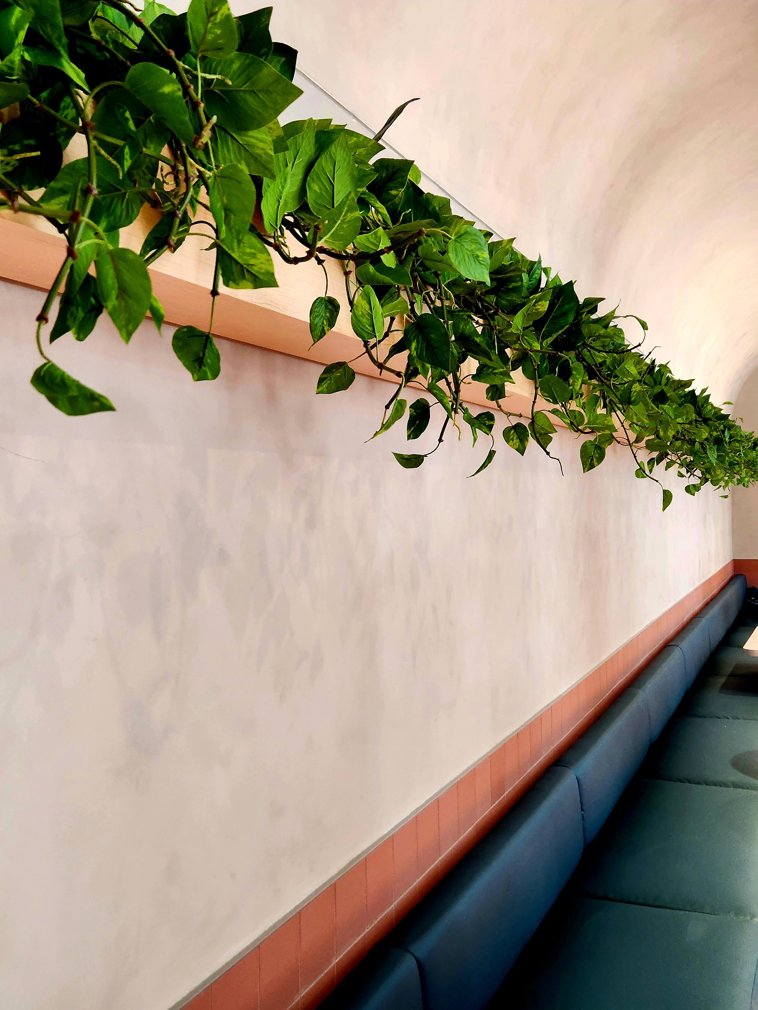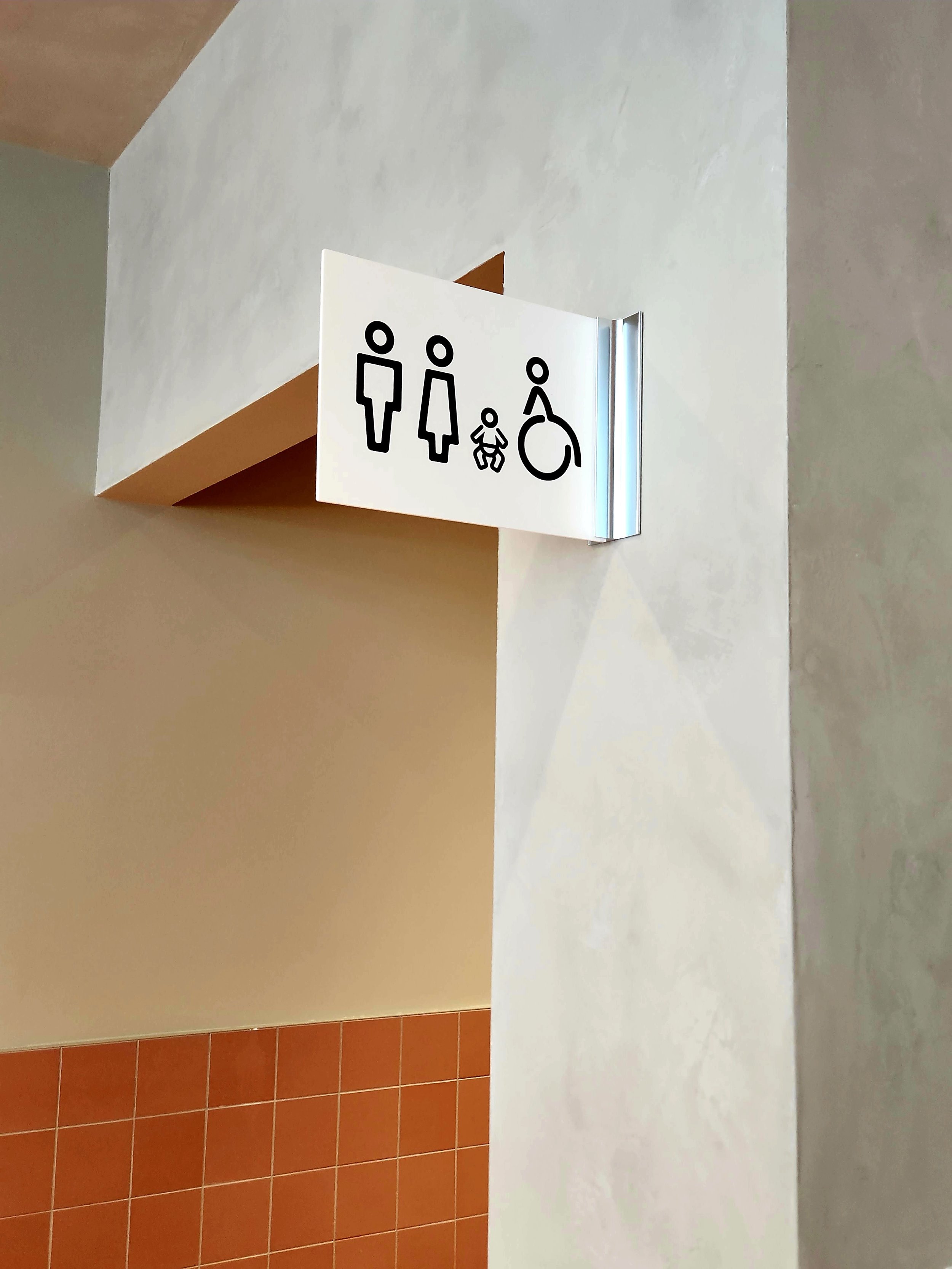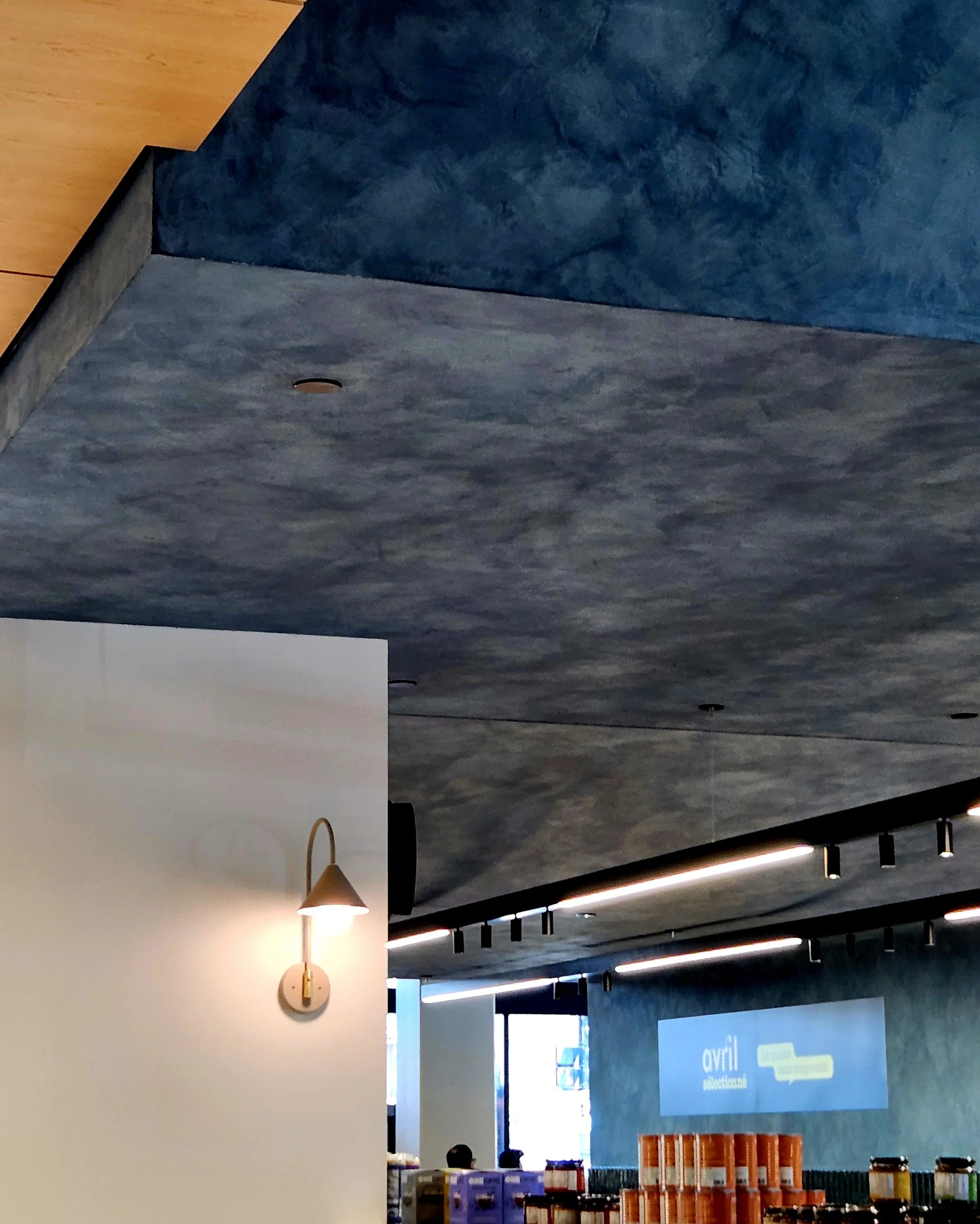 Des bleus profonds aux nuances vaporeuses dans les espaces de vente, des tons sable et rosés dans les zones de repos et de circulation : chaque surface a été pensée pour porter l'identité de la marque. Une identité qui s'incarne dans la matière — naturelle, respirante, vivante.