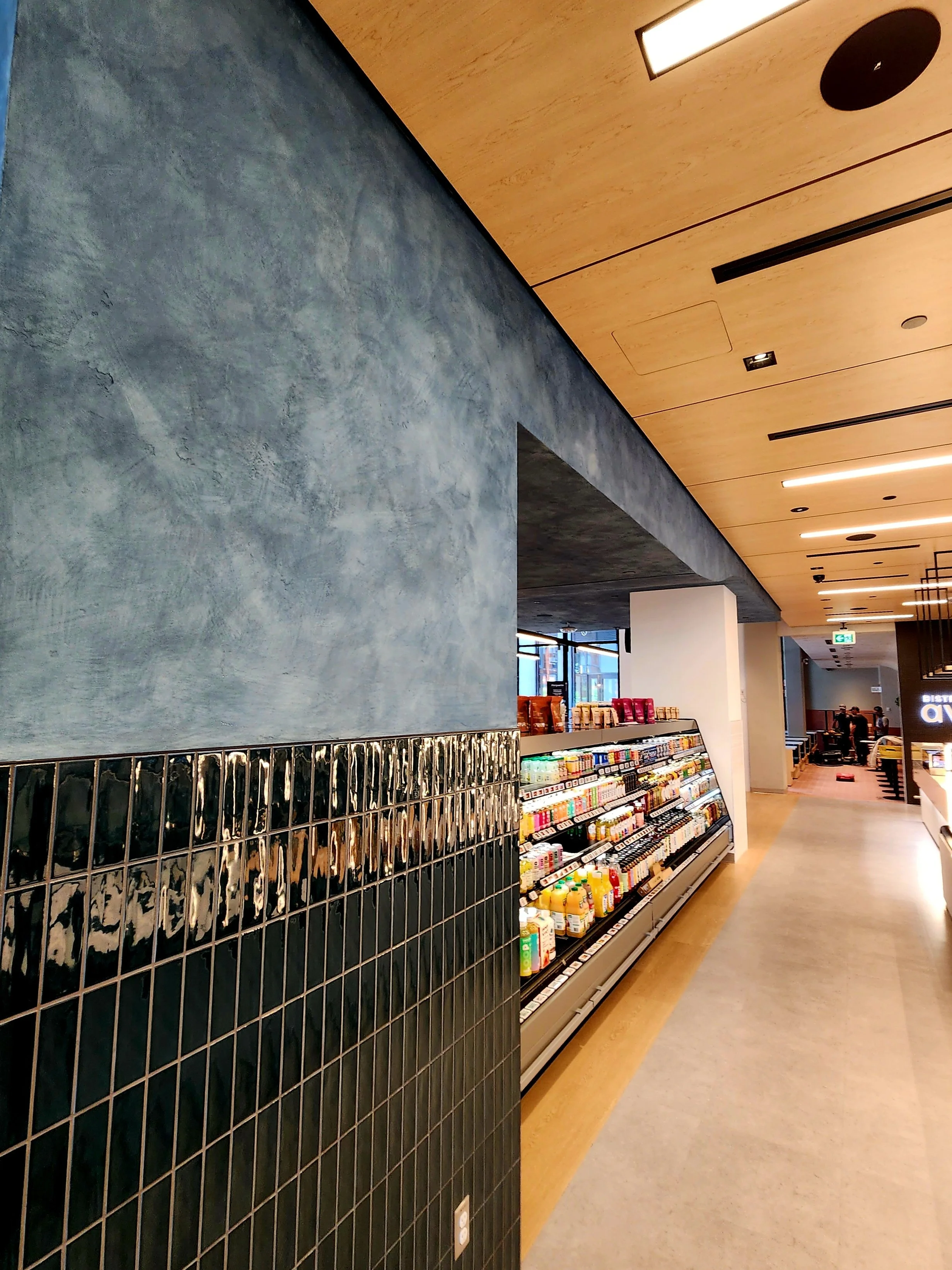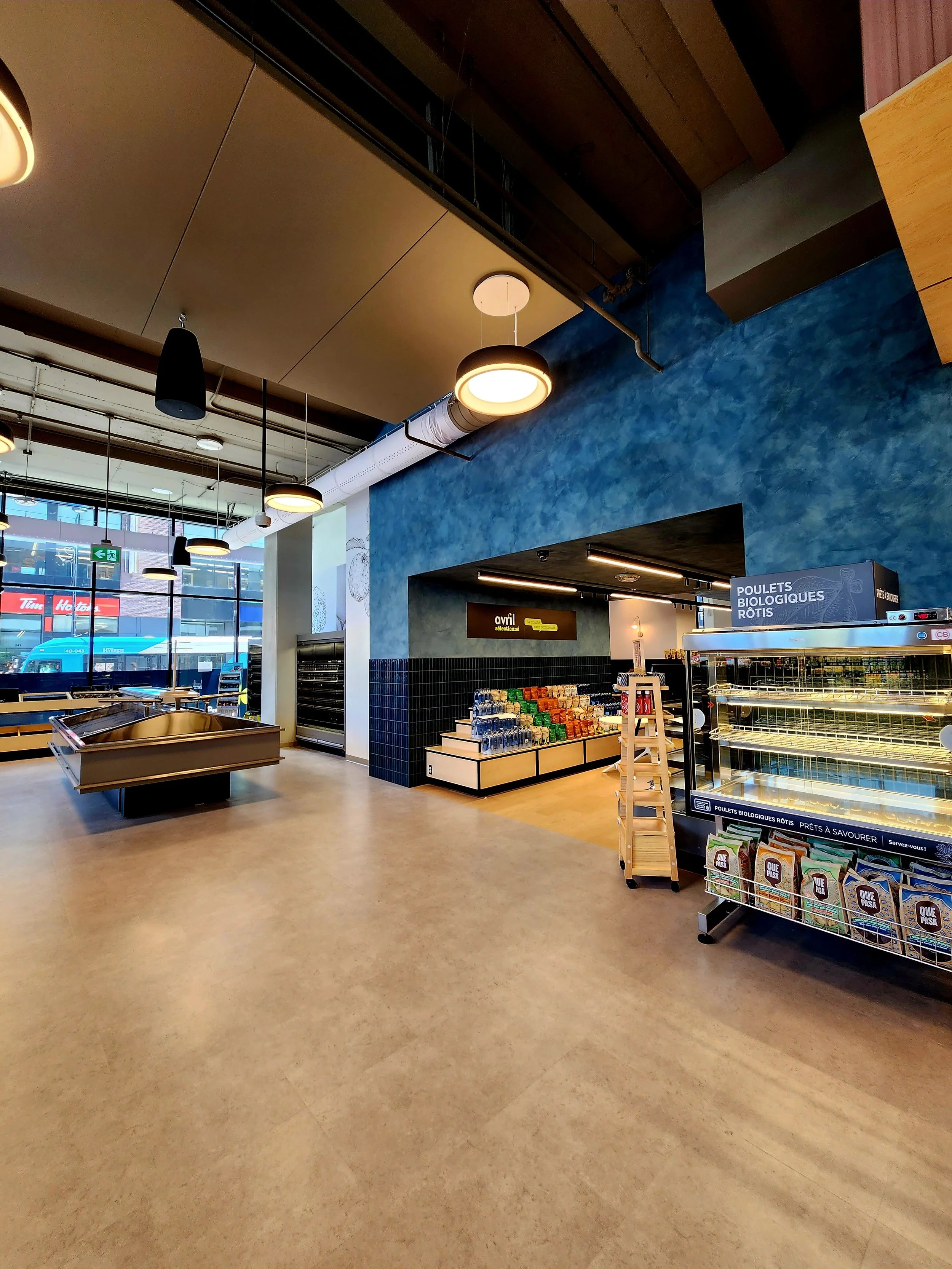 Pour ce projet commercial d'envergure, l'ensemble des finitions murales naturelles de cette nouvelle succursale du supermarché Avril — une enseigne québécoise emblématique dédiée au mieux-vivre — ont été conçues et réalisées avec soin.