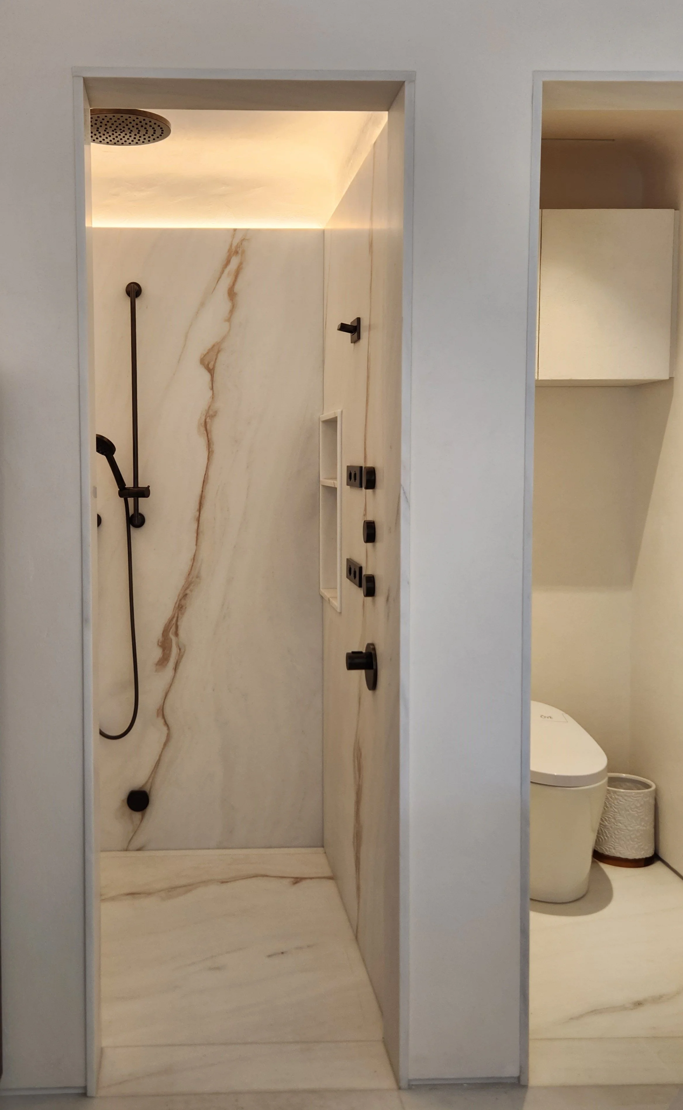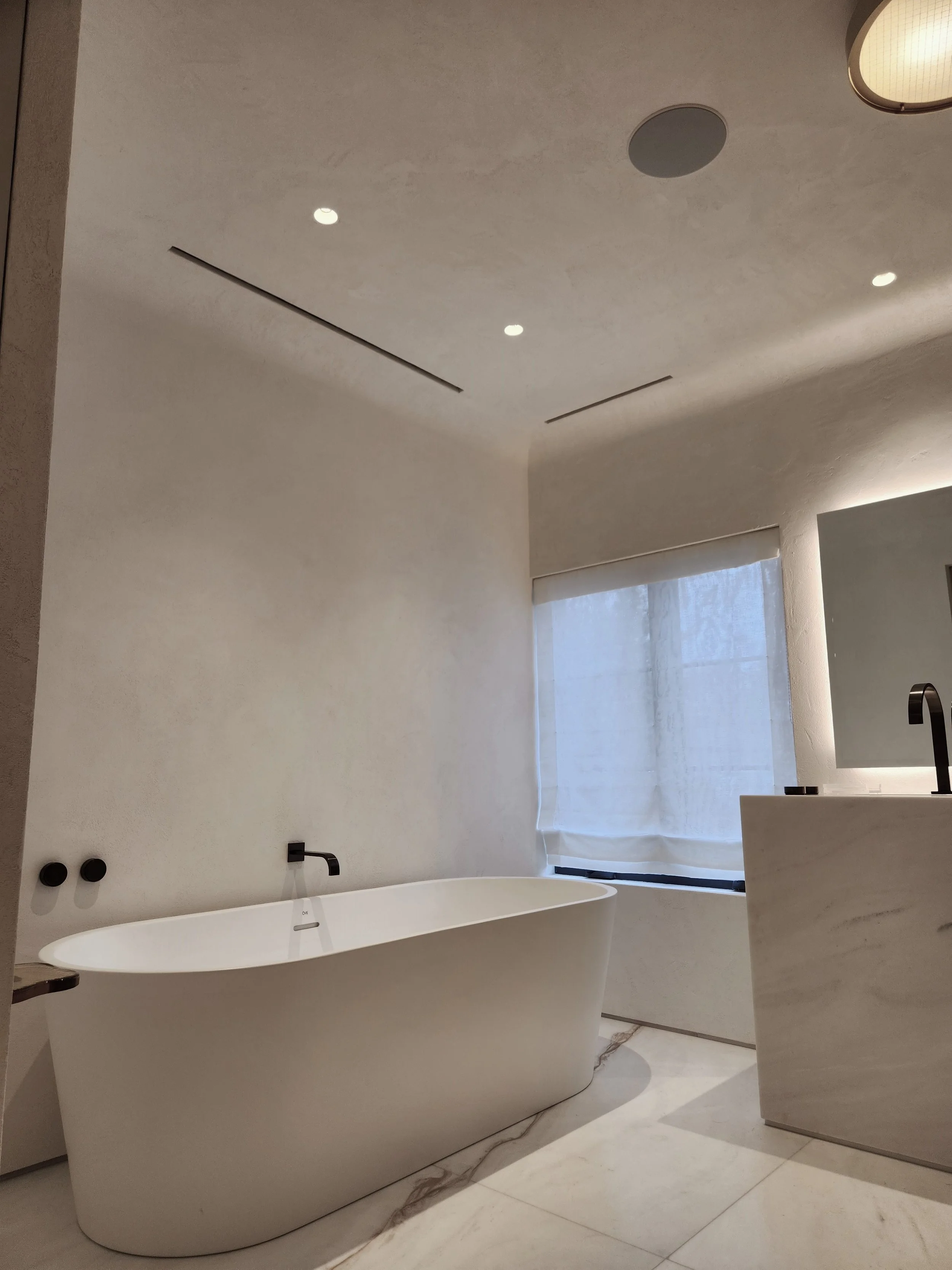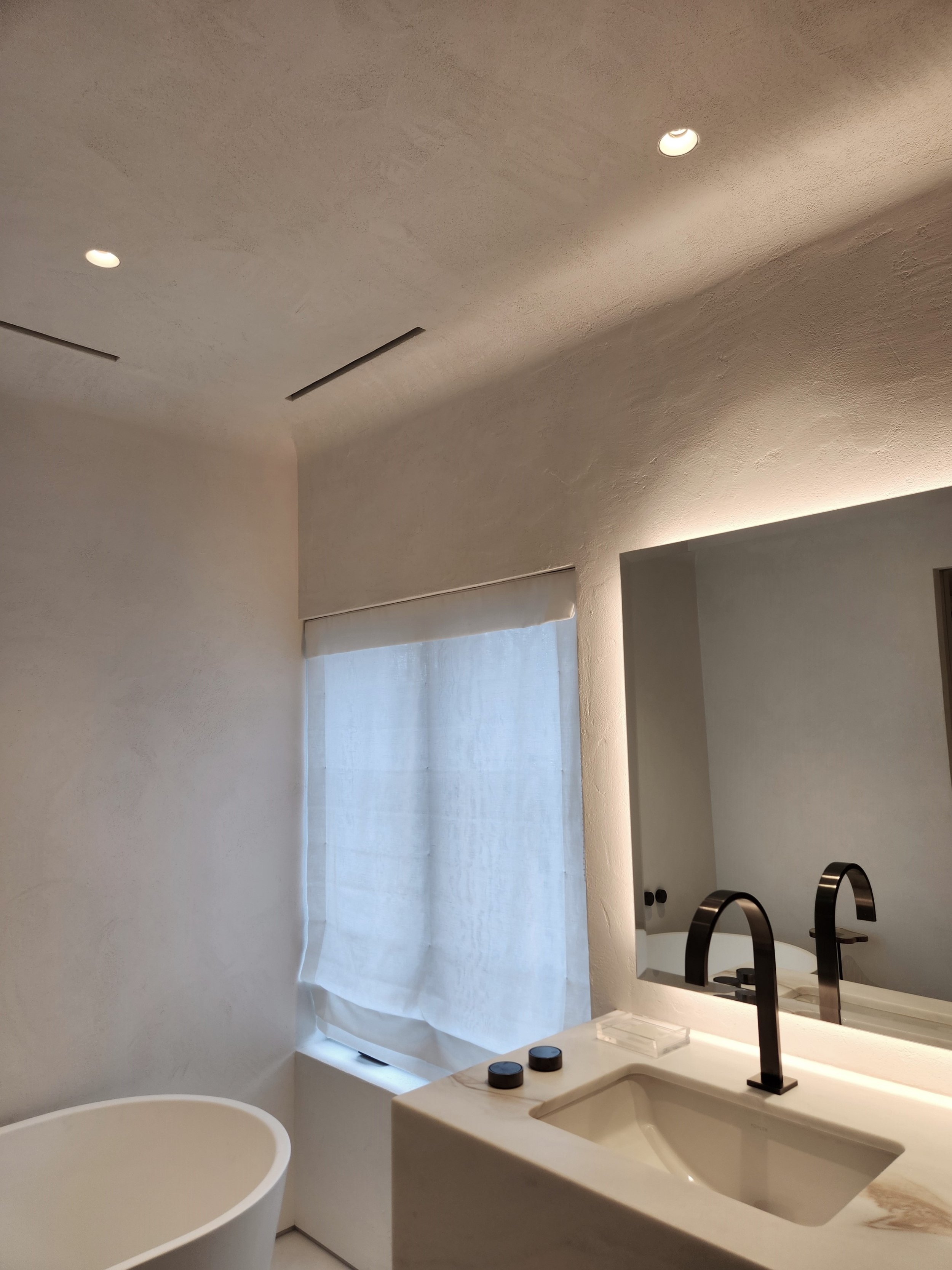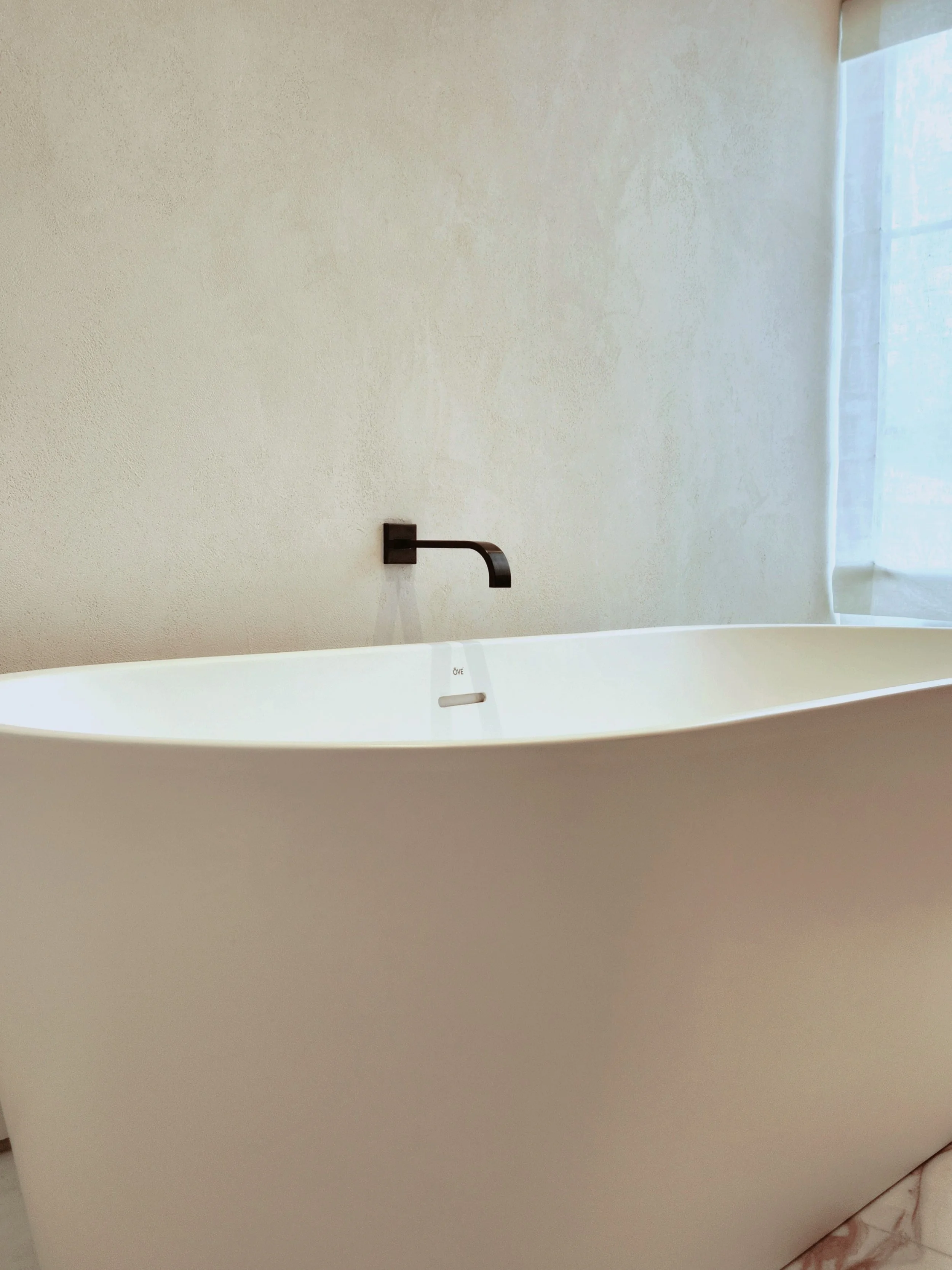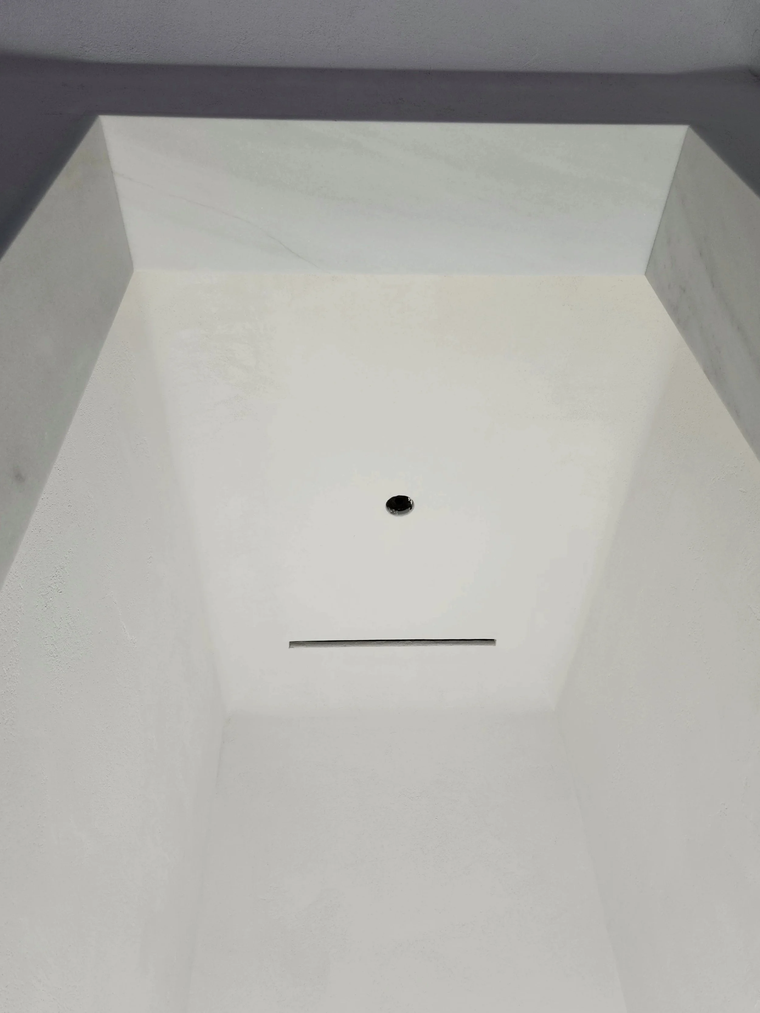 Murs et plafonds se rejoignent en une douce continuité de courbes, tissant une osmose parfaite et des harmonies délicates entre la texture brute et mate de l'enduit à la chaux et la grâce raffinée des marbres.