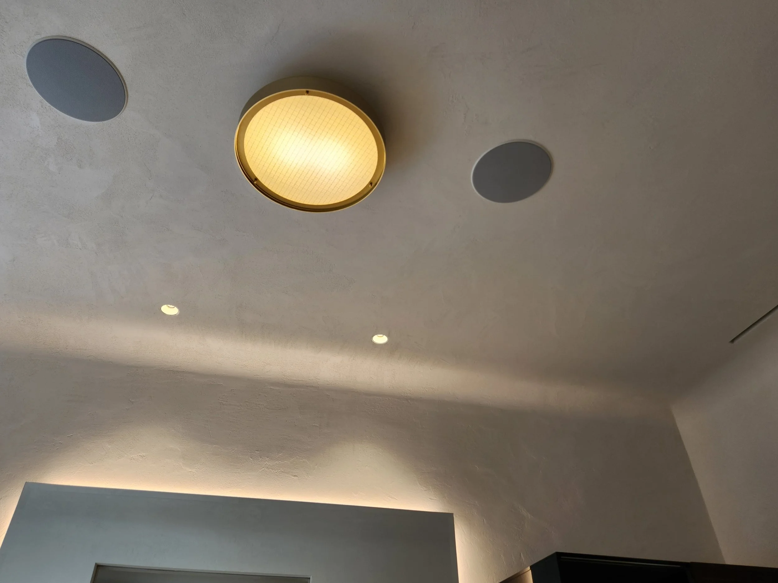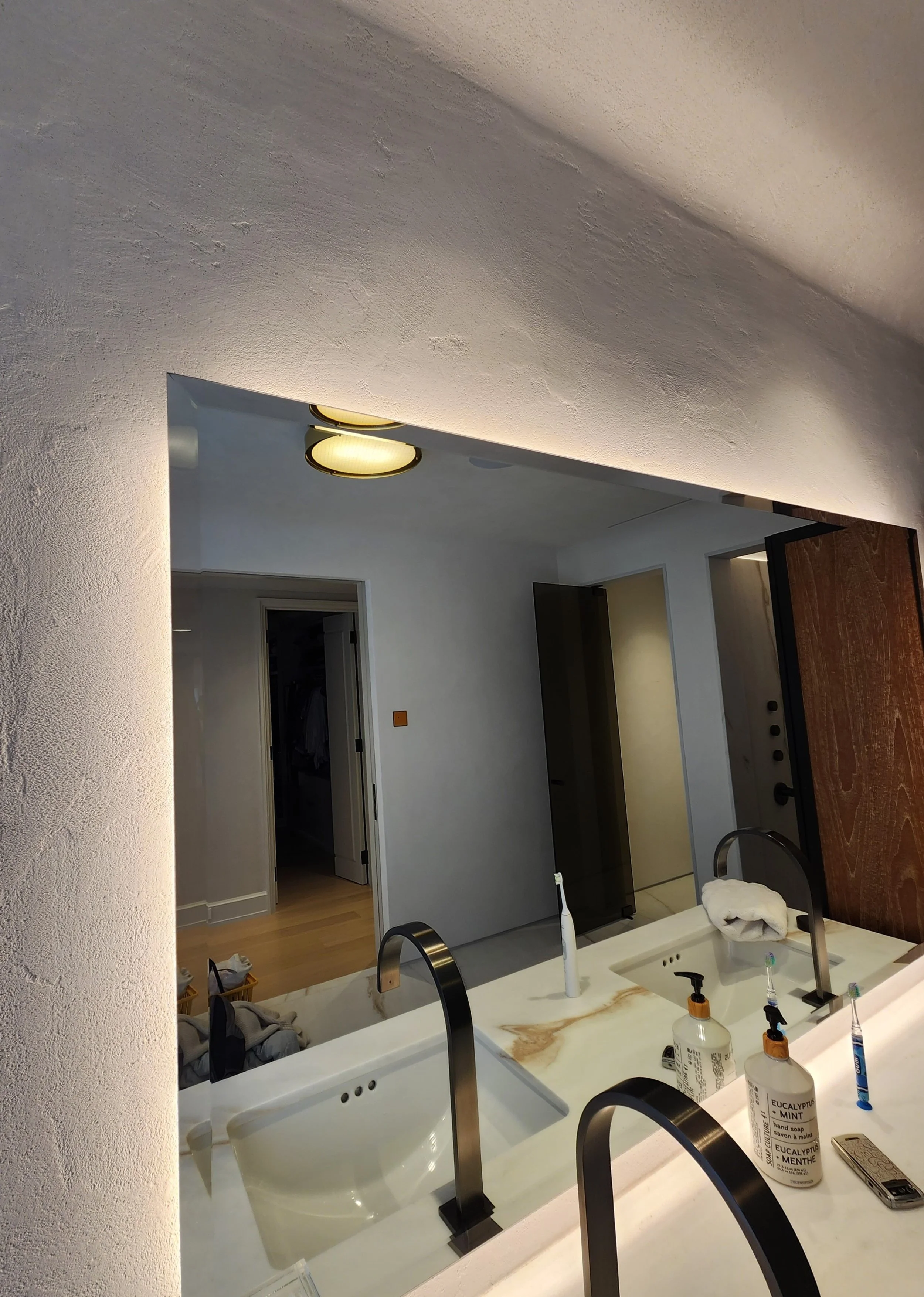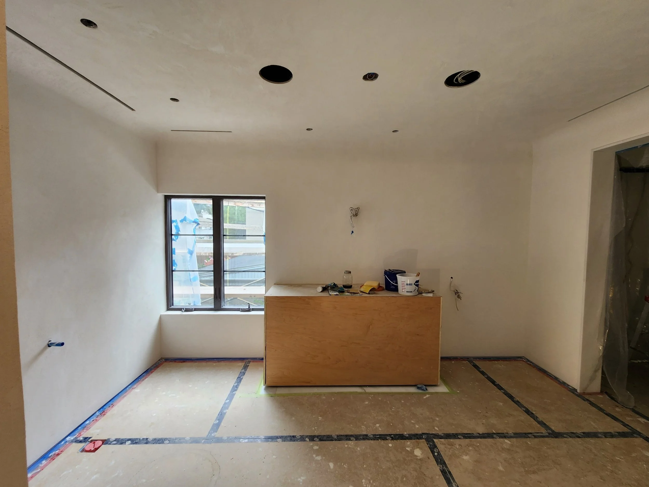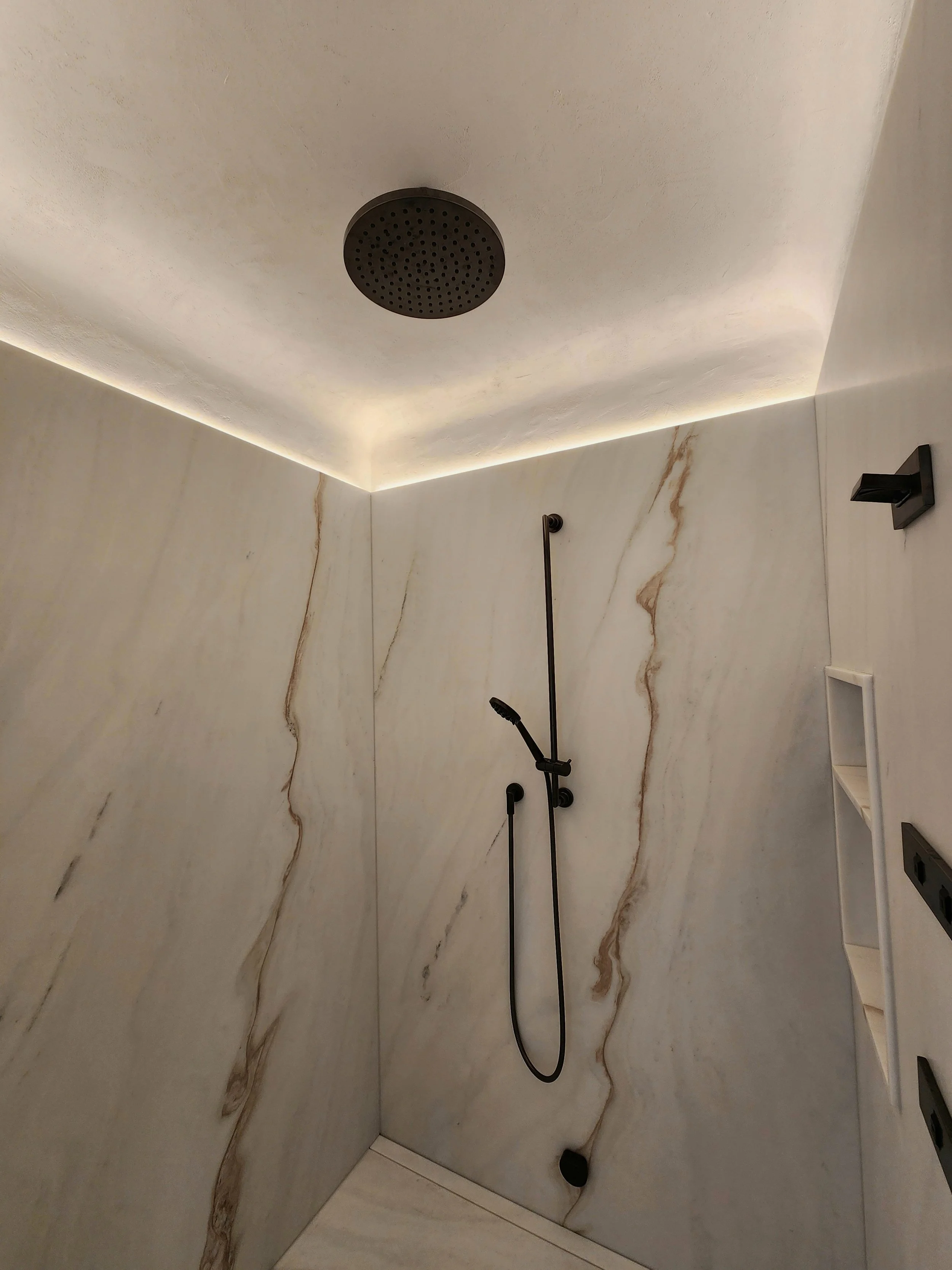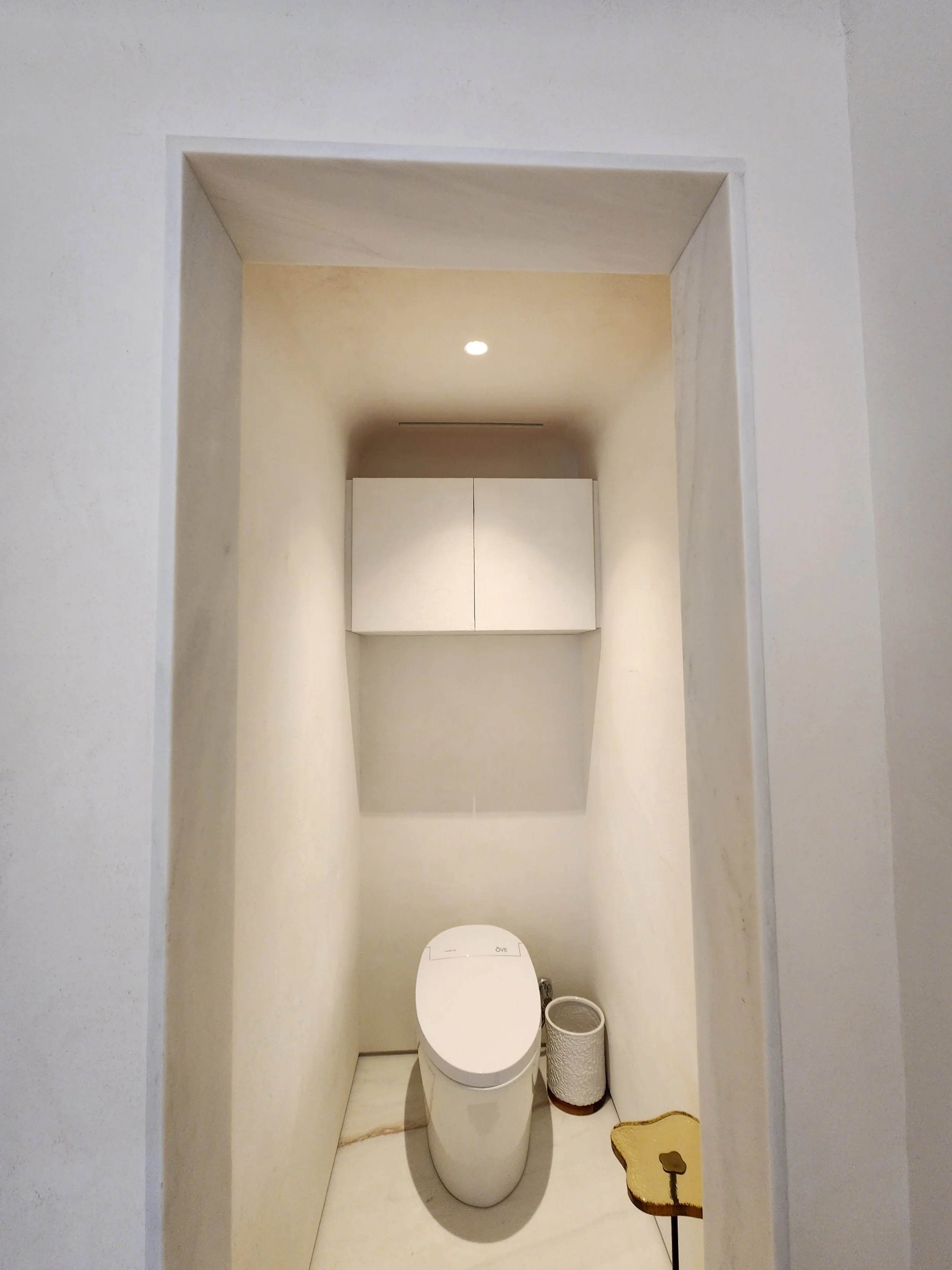 Murs et plafonds se rejoignent en une douce continuité de courbes, tissant une osmose parfaite et des harmonies délicates entre la texture brute et mate de l'enduit à la chaux et la grâce raffinée des marbres.