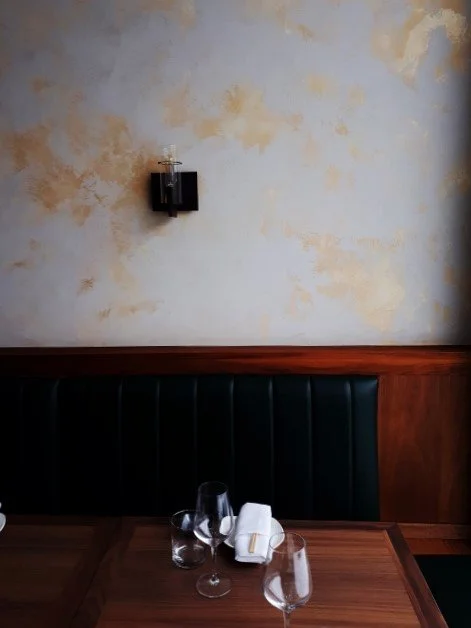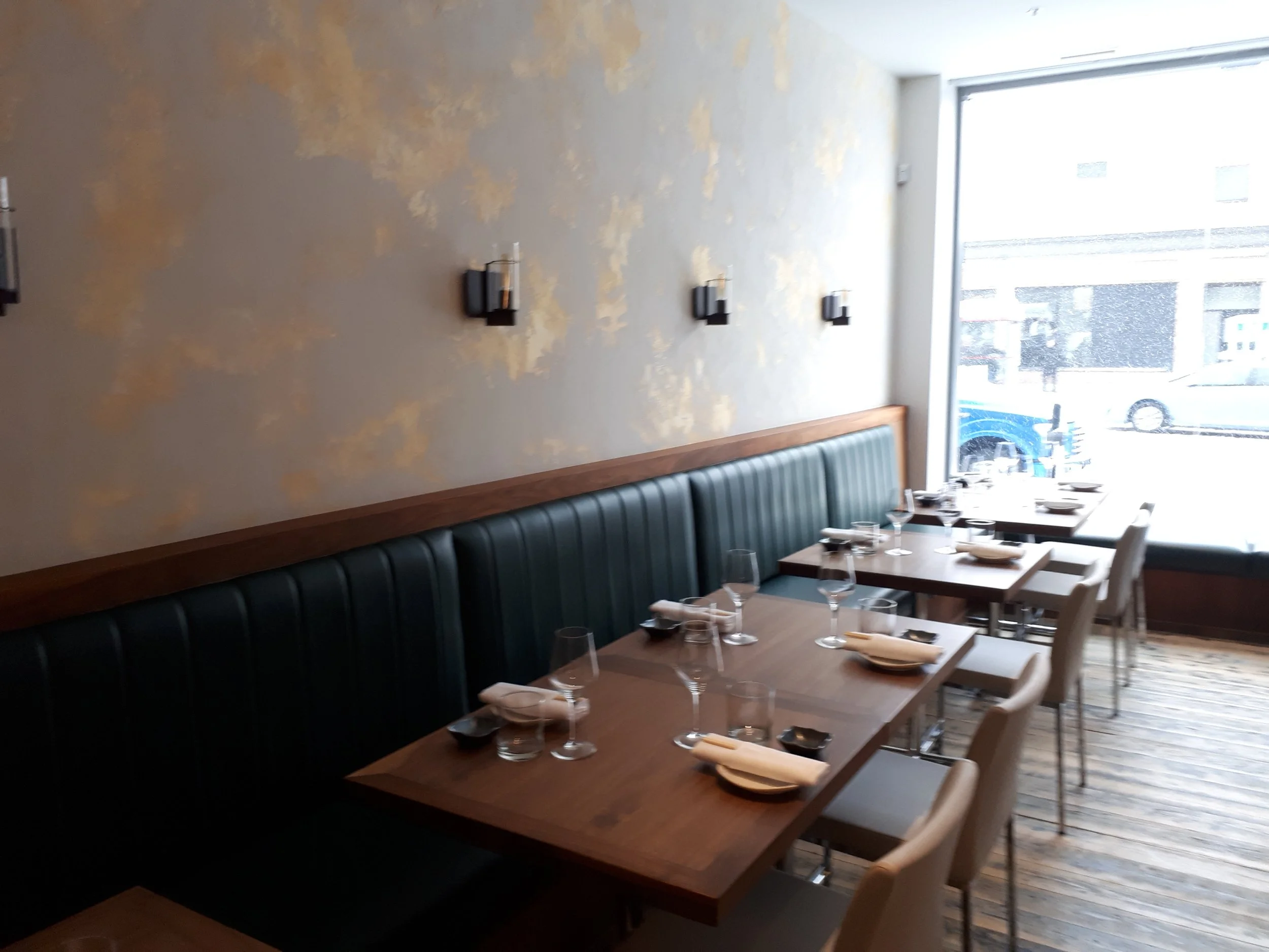 Situé sur la rue Laurier Ouest, à deux pas de l'avenue du Parc à Montréal, ce charmant restaurant de sushi baigne dans une luminosité envoutante. Son décor simple, mais élégant, captive immédiatement l'attention. Les murs, recouverts d'un enduit délicat, ont été subtilement agrémentés de touches de dorure. Cette combinaison unique crée l'illusion d'un mur usé, révélant des surfaces dorées d'autrefois. L'atmosphère qui en résulte est à la fois intemporelle et captivante.